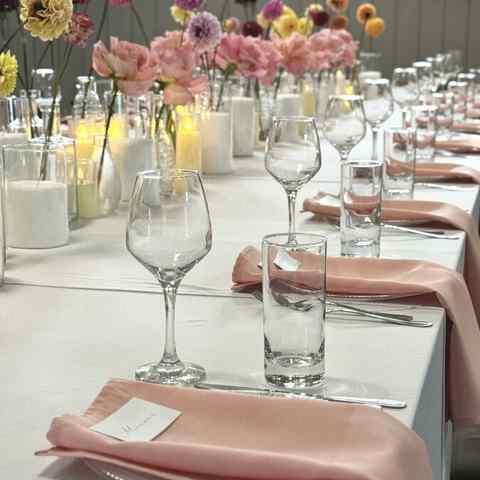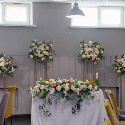 Банкетный зал просторный и вмещает до 50-ти гостей. В таком пространстве остается место для зажигательных танцев, размещения конферансье или кавер-исполнителя. Гостям предлагается альтернативная расстановка мебели: круглые столы или классические варианты на прямоугольных столах.