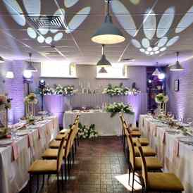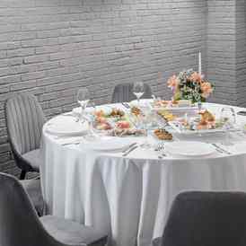 Банкетный зал просторный и вмещает до 50-ти гостей. В таком пространстве остается место для зажигательных танцев, размещения конферансье или кавер-исполнителя. Гостям предлагается альтернативная расстановка мебели: круглые столы или классические варианты на прямоугольных столах.
